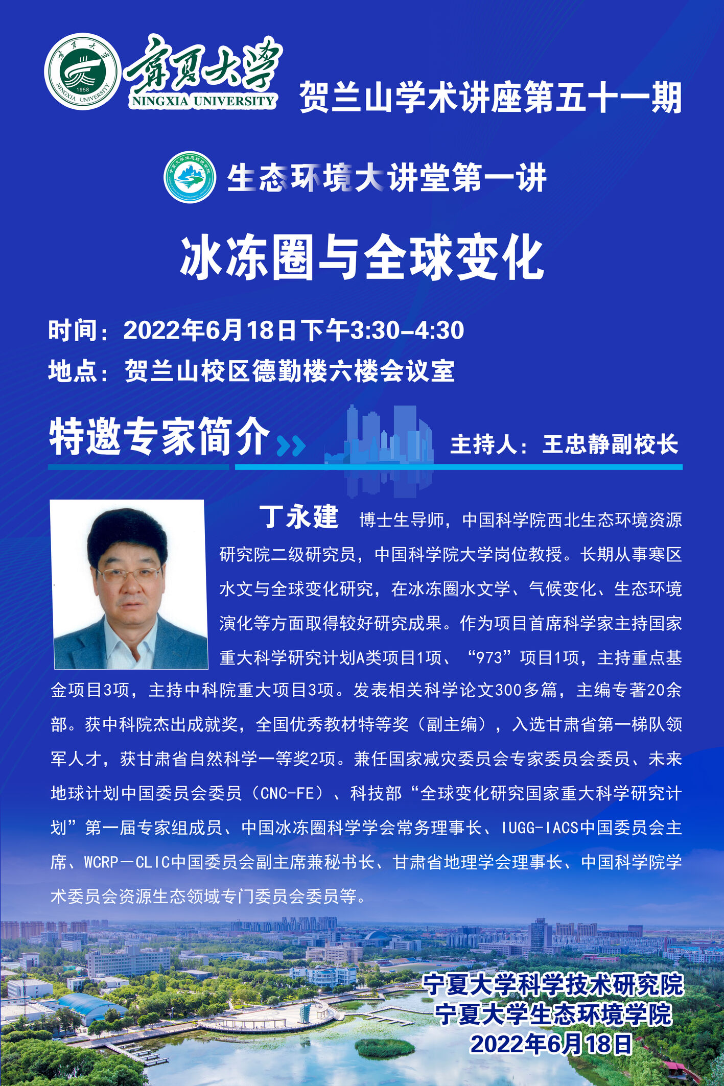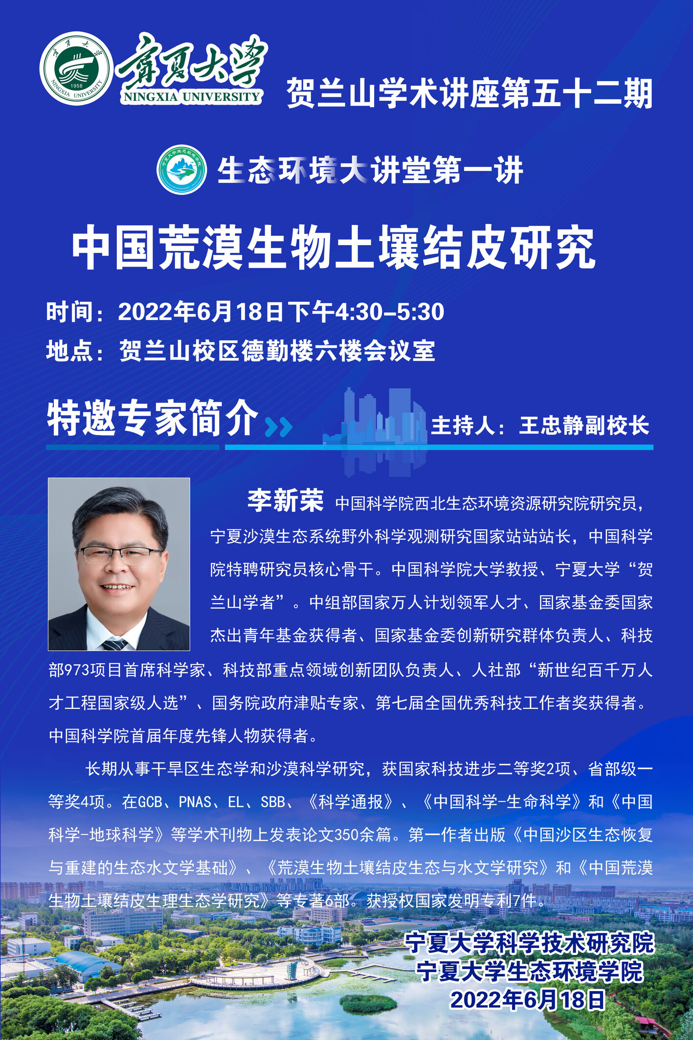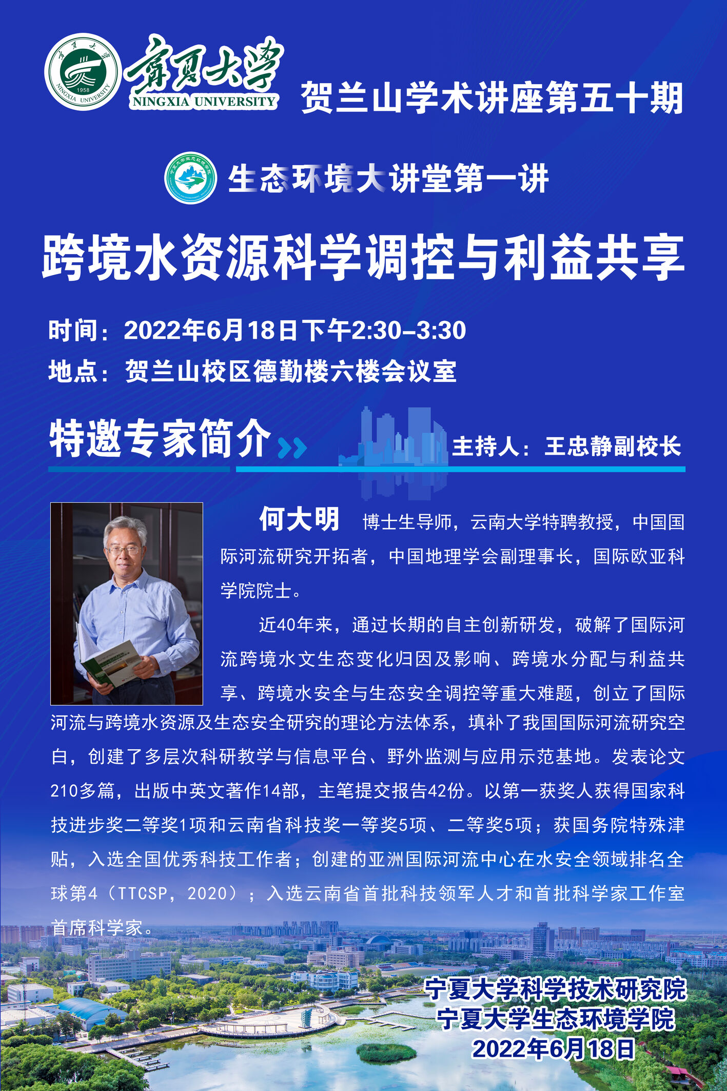 公司定于6月18日(本周六)下午2:30-5:30,在贺兰山校区德勤楼六楼会议举办“贺兰山论坛-生态环境大讲堂第一讲”,特邀请欧亚科公司院士、云南大学何大明教授,中科院寒旱所原副所长、国家重大科学研究计划项目首席科学家丁永建研究员,国家杰青获得者、中科院西北生态环境资源研究院李新荣研究员,带来3场学术讲座,“跨境水资源科学调控与利益共享”、“冰冻圈与全球变化”、“中国荒漠生物土壤结皮研究”。请各位老师积极参加学术交流!