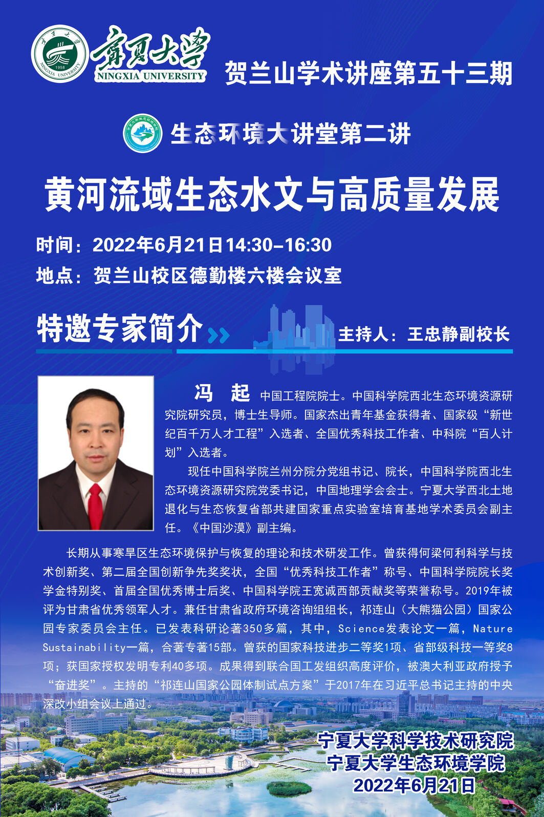公司定于6月21日(周二)下午2:30-4:30,在贺兰山校区德勤楼六楼会议举办“贺兰山论坛-生态环境大讲堂第二讲”,特邀请中国工程院院士冯起院士,带来“黄河流域生态水文与高质量发展”讲座。请各位老师积极参加学术交流!