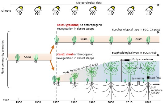公司杜灵通研究员与荷兰特文特大学ITC水资源系合作,带领团队围绕这一科学问题、以宁夏盐池县荒漠草原种植的人工灌木林为研究对象,采用模型模拟和涡度相关通量观测的方法(图2),揭示了人工灌丛入侵荒漠草原的碳水循环响应机理(图3)。研究得出,荒漠草原人工种植灌木显著地增强了陆地生态系统的碳循环,增加了生态系统的碳储量,使生态系统由弱碳源向强碳汇转变。同时,增强了生态系统的蒸散耗水量,降低了土壤贮水,这将对生态系统的稳定性产生影响。因此,在双碳背景下,在荒漠草原区种植灌木有利于碳中和目标实现,但一定要考虑其生态水文阈值。该成果近期以“Effects of anthropogenic revegetation on the water and carbon cycles of a desert steppe ecosystem”为题发表在农林类一区TOP期刊《Agricultural and Forest Meteorology》上。