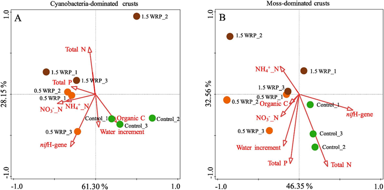 Fig.4. Redundancy analysis showing the relationship between nitrogenase activity (NA) in cyanobacteria- and moss-dominated crusts and biocrust-soil parameters.