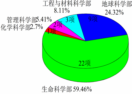 本年度申请的37项项目中,生命科学部最多,达22项,占总项目的59.46%;其次是地球科学部,有9项,占比为24.32%;其他3个学部,包括工程与材料科学部、管理科学部和化学科学部也均有涉及,分别有3项,2项和1项。