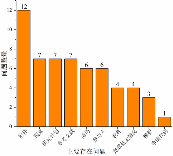在对公司37项申请项目进行形式审查过程中也发现了申请书中易出错的一些问题,附件材料不完整为主要问题,其次是经费预算、研究计划安排、参考文献、个人简历、参与人信息,其他存在的问题包括职称信息、完成基金情况和申请书模板及申请代码亦或多或少存在问题。