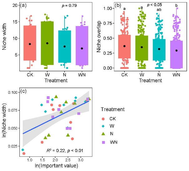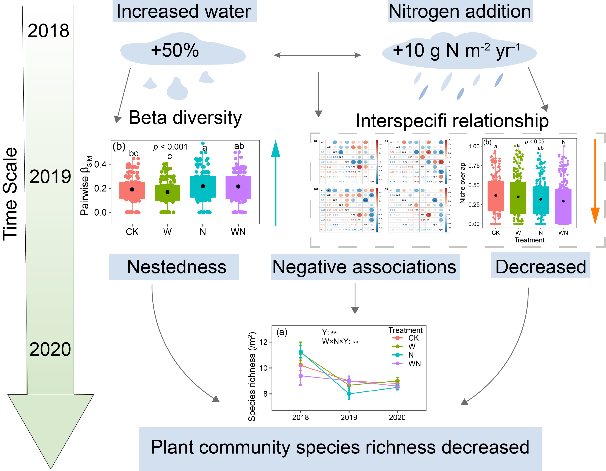 该研究依托盐池县荒漠草原生态系统的全球变化联网试验平台,研究了水氮添加对荒漠草原物种多样性(α和β多样性)、种间关系和群落动态的影响,阐明水氮添加对植物群落和优势种群种间关联的影响机制。研究发现:水氮添加显著影响α多样性,而氮添加显著增加总β多样性和成对β多样性。氮添加处理的群落与优势群落的种间关联呈显著负相关关系。水氮添加通过优势种的种间关联显著影响荒漠草原物种多样性。