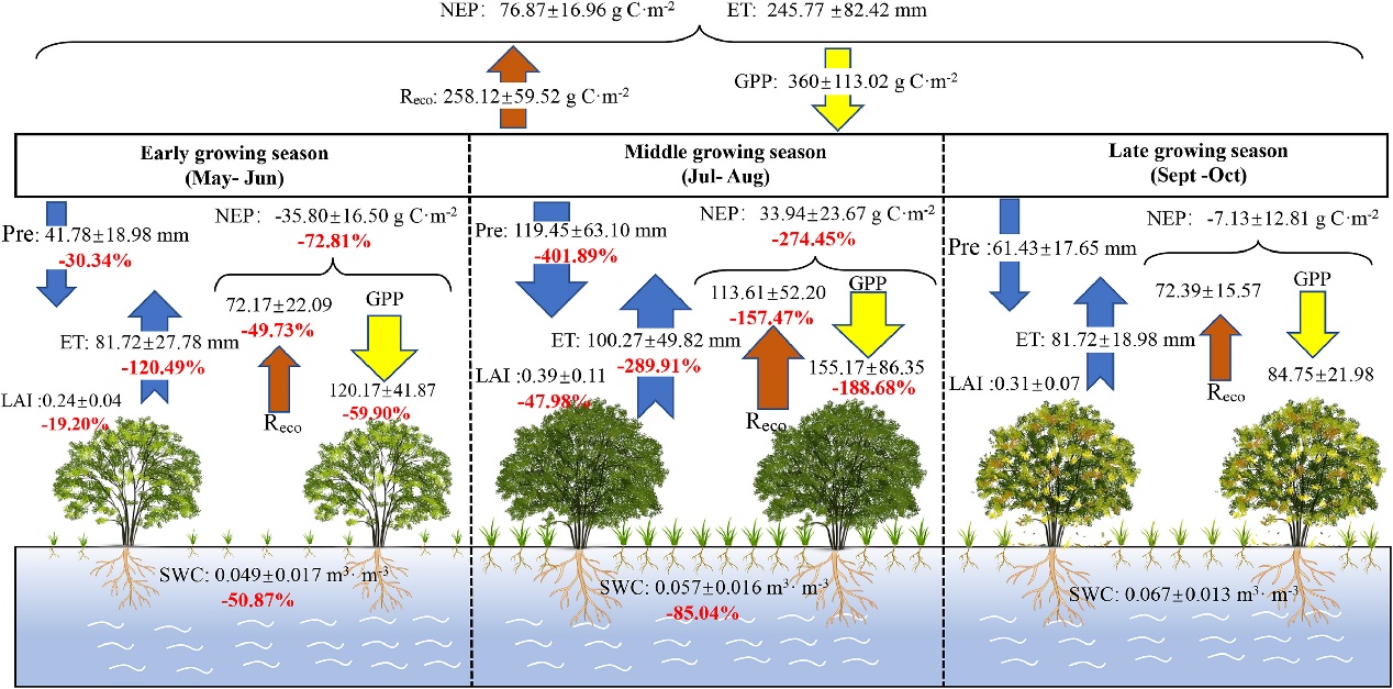 荒漠草原地区营建耐旱灌木进行防沙治沙是中国西北地区常见的生态治理措施,这种人工建植的灌丛生态系统的碳循环过程及其对气候变化的响应是当前亟需解决的基础问题。该研究基于涡度相关碳通量观测技术,在宁夏盐池开展长时间碳通量观测,并分析了干旱对人工灌丛生态系统碳循环的影响,发现生长季中期的干旱会更显著抑制该生态系统碳汇能力。