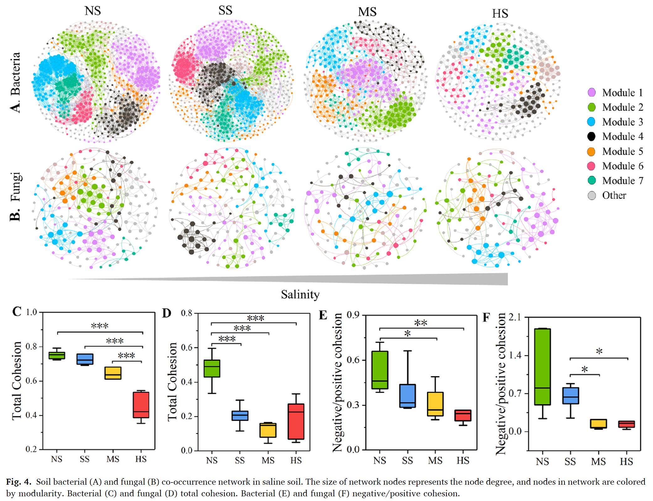 灌溉方式和地下水位是导致干旱和半干旱地区土壤盐渍化的关键因素。然而,黄河灌溉和补给造成的土壤盐渍化对惠农区微生物群落及其功能的影响尚未得到深入研究。该项研究采用高通量测序技术分析了盐渍化土壤梯度上细菌和真菌群落的多样性、组成和结构。研究结果表明,微盐渍土细菌群落的α多样性明显高于高盐渍土;土壤盐渍化显著影响了细菌和真菌群落的组成。高度盐渍化的土壤富含细菌类群,如Halomonas,Salinimicrobium,Pseudomonas,Solibacillus, andKocuria,以及真菌群落,包括Emericellopsis,Alternaria, andPodospora。在重度盐渍化土壤中,与铁呼吸、硫呼吸和碳氢化合物降解相关的细菌类群更为普遍,而与土壤arbuscular mycorrhizal symbiosis, endophytes, dung saprotrophy, leaf saprotrophy, soil saprotrophy, fungal parasitism和植物致病性等功能相关的真菌类群则不丰富。采用随机森林分析确定了9种细菌和18种真菌分类群作为盐渍土盐度鉴别的潜在生物标志物。共生网络分析进一步揭示,土壤盐渍化压力降低了细菌和真菌群落的整体复杂性和稳定性。此外,随着盐度的增加,细菌群落组装呈现出从随机过程向确定性过程转变的趋势,而真菌群落组装仍以确定性过程为主。提供强有力的证据表明,土壤盐分是惠农地区土壤生物地球化学过程的主要抑制剂,在塑造细菌和真菌群落、共生网络及其组装过程中起着至关重要的作用。