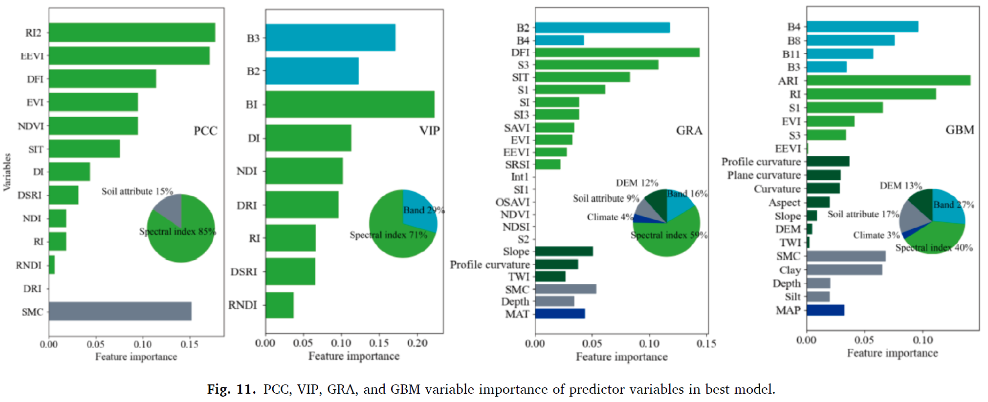 土壤盐碱化对生态环境构成严重威胁,建立监测系统是防止盐碱化蔓延的有效方法。盐渍土主要分布在干旱和沿海地区,很少有高精度的跨区域土壤含盐量反演模型来研究盐渍土的光谱异质性。本研究以中国干旱和沿海地区的典型盐碱地为研究对象。Sentinel 2数据(包括波段和光谱指数)和实测土壤含盐量、土壤质地、温度、降水量、含水量和DEM数据用于建立干旱海岸反演模型。使用PCC、VIP、GRA和GBM等变量选择方法,并使用PLSR、RF、ERT、LightGBM等模型进行建模。结果表明,不同地区盐渍土的反射率和曲线形态存在差异。干旱沿海地区常见的敏感特征变量是PCC中的光谱指数和土壤性质,VIP中的光谱变量带和指数,GRA和GBM中的所有变量都包含。干旱沿海地区的建模精度低于干旱地区,但高于沿海地区。干旱海岸反演模型PCC LightGBM的反演性能最好,R2和RMSE分别为0.62和2.29,RI2对该模型的贡献最大(18%)。分析表明,干旱区和沿海地区的土壤盐渍化具有不同的特征变量,在相同的方法下,干旱区模型的精度高于沿海地区。本研究可为沿海和干旱区土壤盐渍化监测和土地复垦提供参考。