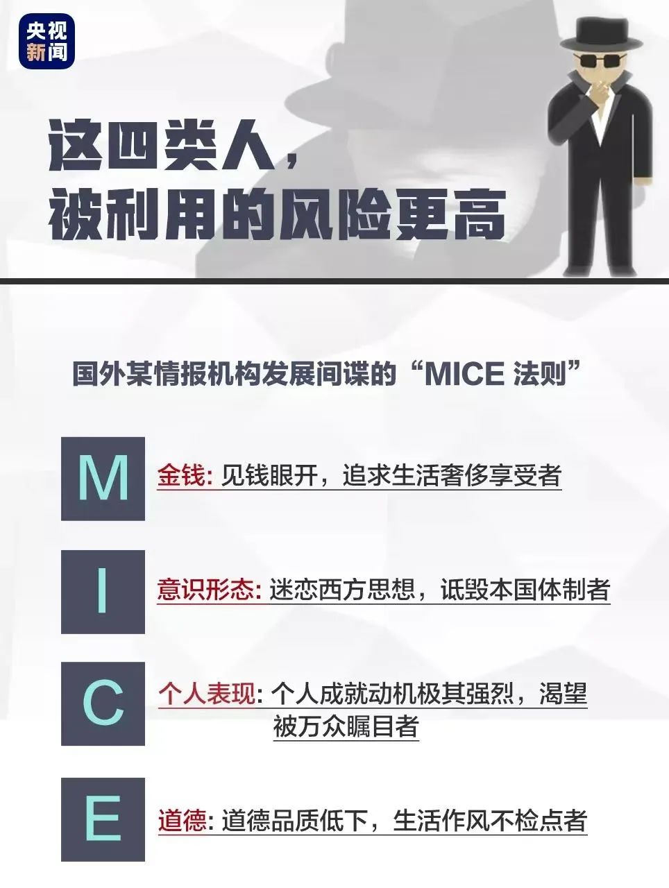 据国家安全机关统计,职工、高校师生、军事发烧友、军工企业国防科研单位人员、年轻网友等容易被境外间谍机构策反,可能会被利用。